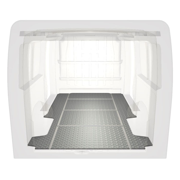 Plancher léger et robuste avec rails transversaux pour une Citroën Jumper / Peugeot Boxer / Fiat Ducato avec une plaque de roulement en aluminium antidérapant et des rails de chargement (longitudinaux et transversaux) pour une installation rapide et sûre des systèmes de rayonnage et autres accessoires.