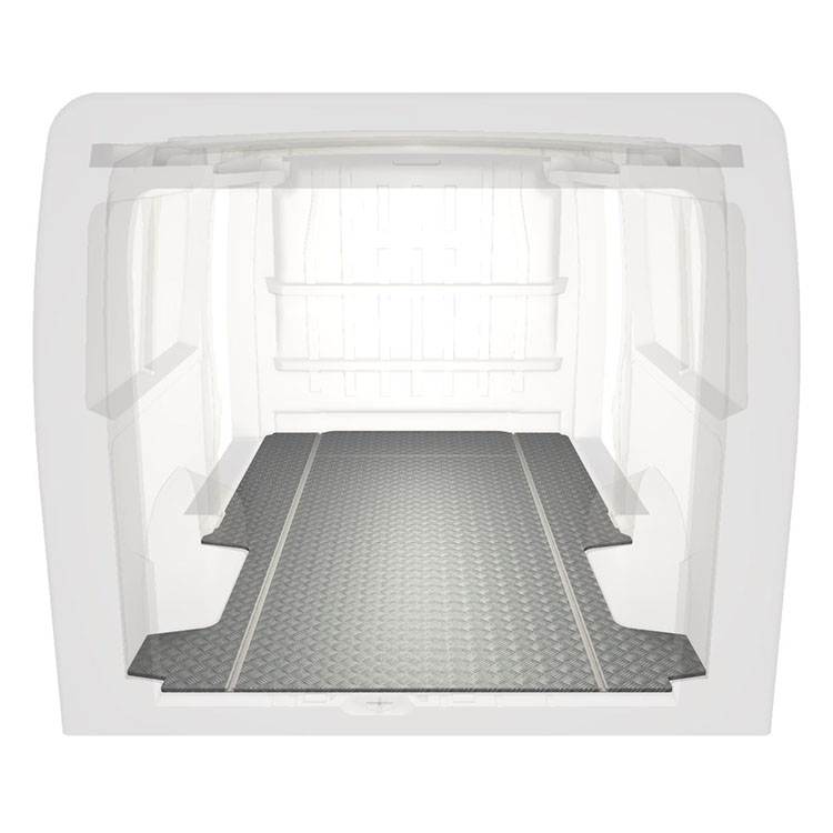 Plancher très long léger et robuste pour une Citroën Jumper / Peugeot Boxer / Fiat Ducato avec une plaque de roulement en aluminium antidérapant et des rails de chargement (longitudinaux) pour une installation rapide et sûre des systèmes de rayonnage et autres accessoires.
