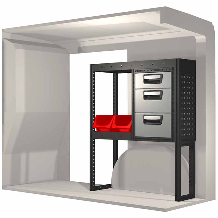 Ce système d’aménagement a été spécialement conçu pour assurer une adaptation optimale ainsi que la meilleure fonctionnalité et sécurité possible. Il a été développé pour un usage professionnel, est flexible et est destiné à des métiers de services dans des domaines variés. Toutes les étagères sont équipées de tapis caoutchouc, et tous les tiroirs de tapis mousse. Les composants d’assemblage et de fixation sont inclus.