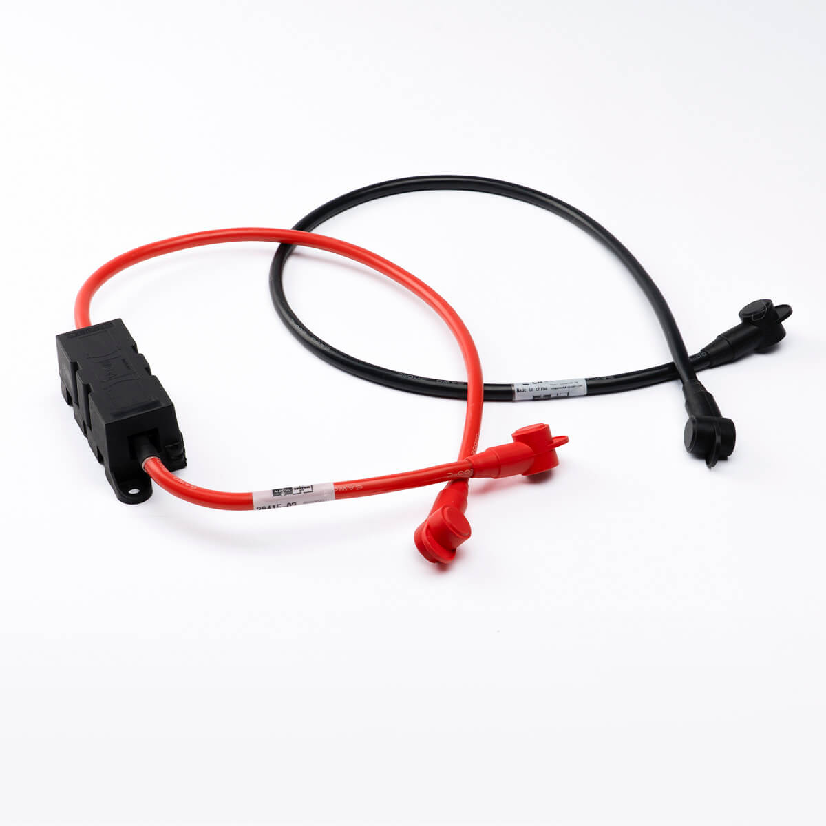 0.8-meter battery cables designed for the 28410-03 e-Heate 1000. Pre-fitted with M8 ring terminals, pole protection caps, fuse holder, and fuse.