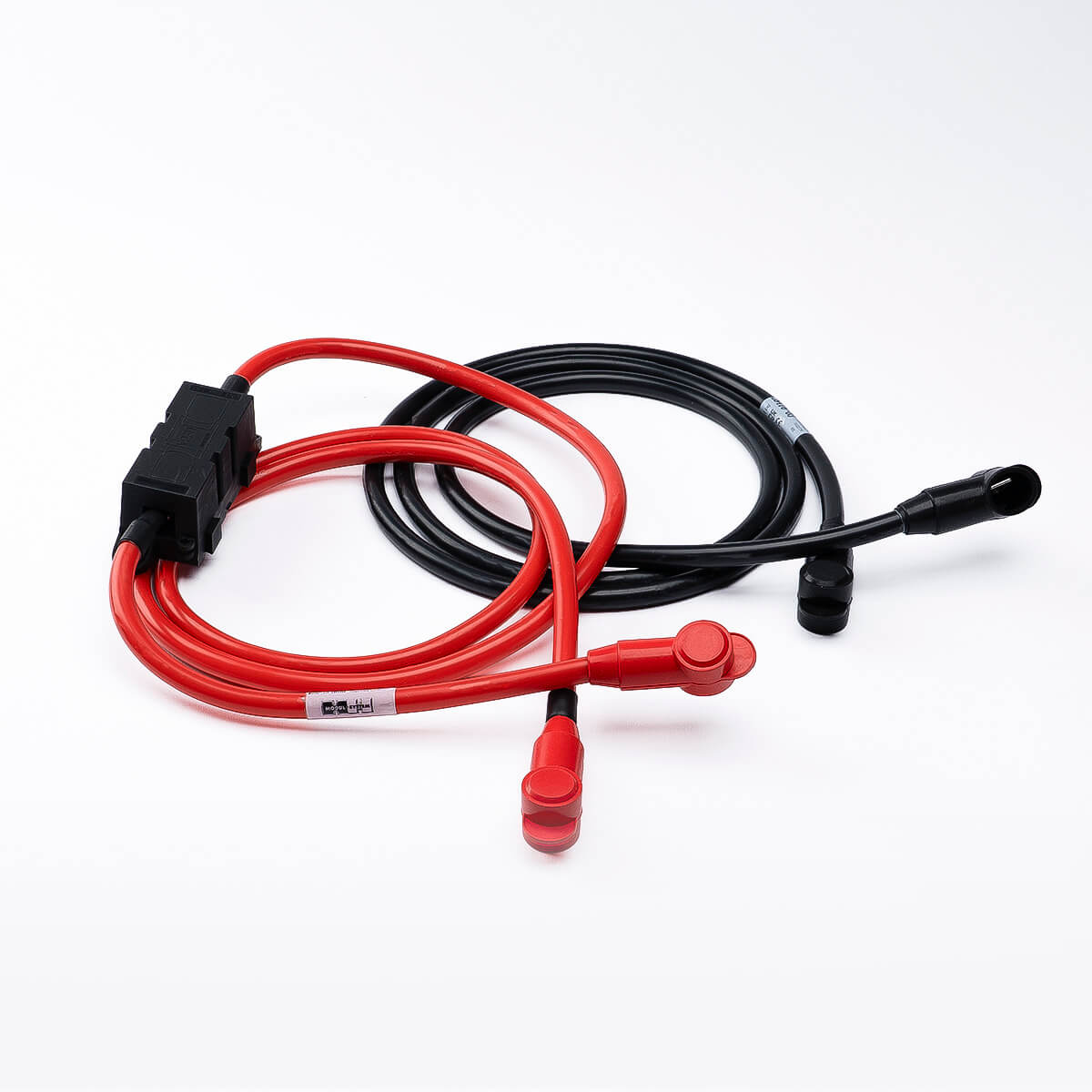 2-meter battery cables designed for the 28420-03 e-Heate 2000. Pre-fitted with M8 ring terminals, pole protection caps, fuse holder, and fuse.