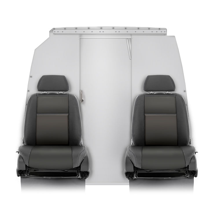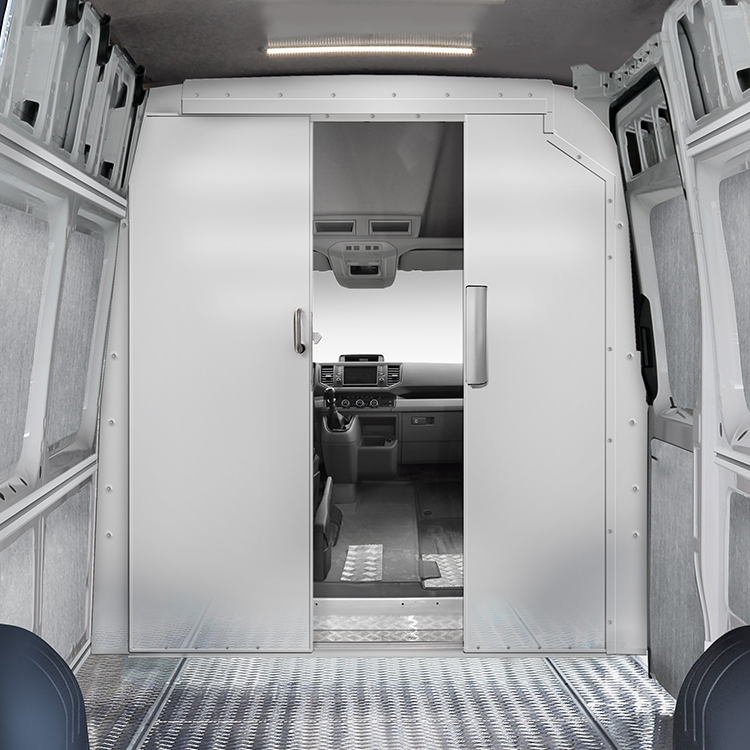 | The bulkhead, made from lightweight material, is equipped with a sliding door for quick and easy access to the cargo area from the cabin. The door is centered to create maximal space between the driver and passenger seat, making loading and unloading easier and more efficient. This bulkhead comes with an extra high door which requires a high cabin roof or modification of low cabin roof. The bulkhead is pre-assembled in the Modul-System factory, which allows for quick and easy installation in the vehicle. Door height: 1760 mm Installation time: 1 hour |