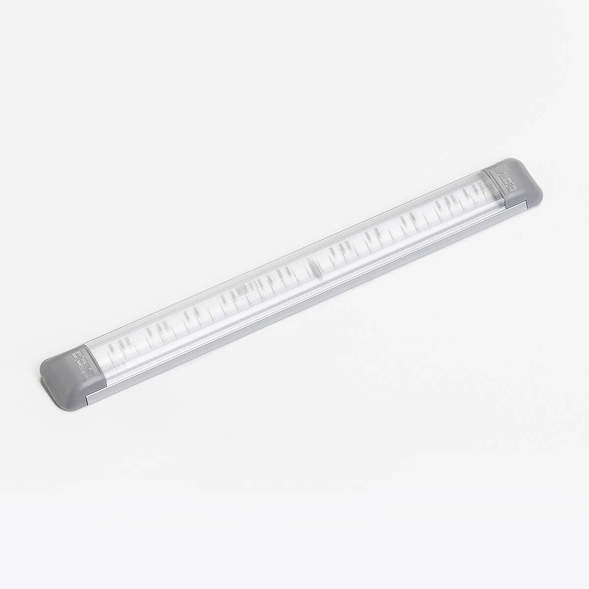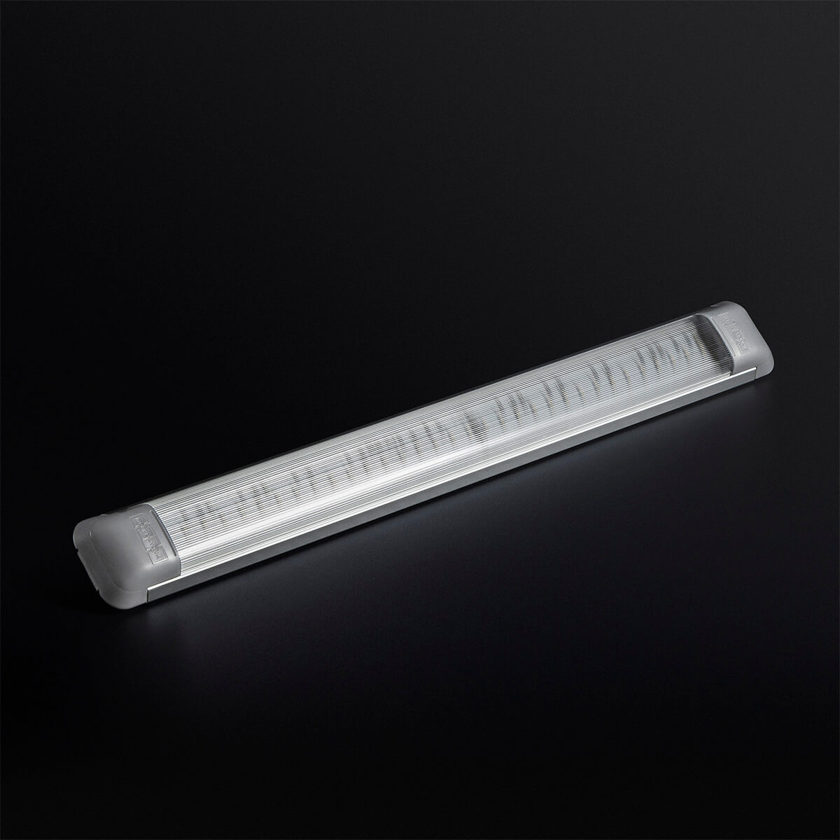 Cette lampe est de conception robuste avec un rail en aluminium et une protection en polycarbonate. L’éclairage est fixé de manière très simple au plafonnier du véhicule ou sur un établi au moyen de vis ou d’adhésif.