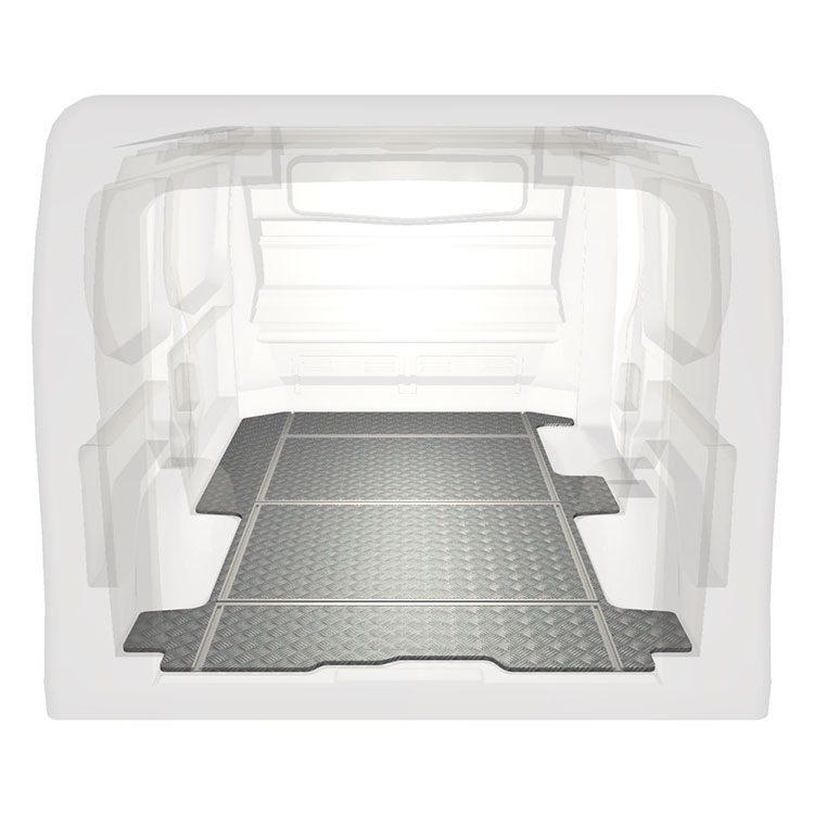 Plancher léger et robuste avec rails transversaux pour une Renault Trafic / Opel Vivaro / Fiat Talento / Nissan NV300 avec une plaque de roulement en aluminium antidérapant et des rails de chargement (longitudinaux et transversaux) pour une installation rapide et sûre des systèmes de rayonnage et autres accessoires.
