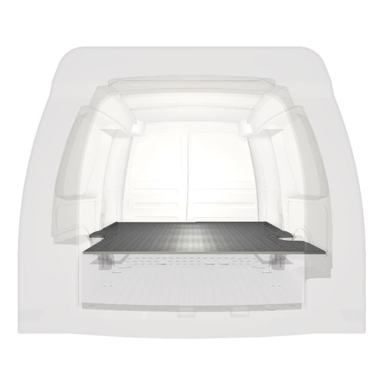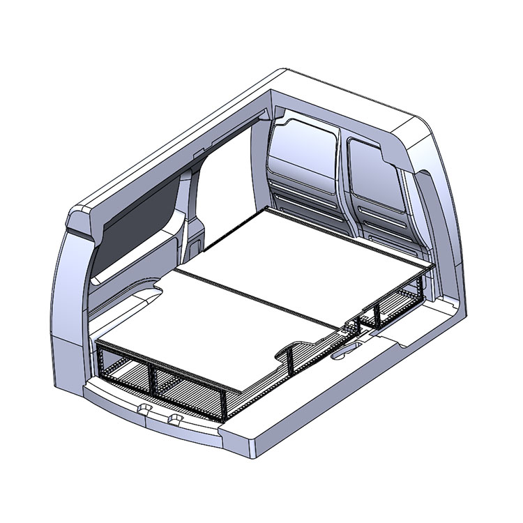 Double floor for a Volkswagen Caddy Maxi 2016-. The floor is designed to fit an extra-long drawer solution with one drawer unit 648x1458x270 and one 486x1458x270 coming out from the rear doors, and one drawer unit 486x1296x270 coming out from the side door.