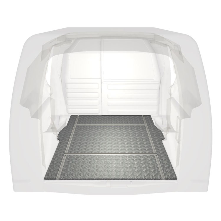 Plancher léger et robuste avec rails transversaux pour une Citroën Berlingo / Peugeot Partner avec une plaque de roulement en aluminium antidérapant et des rails de chargement (longitudinaux et transversaux) pour une installation rapide et sûre des systèmes de rayonnage et autres accessoires.