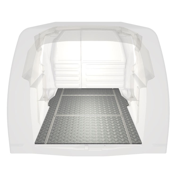 Plancher léger et robuste avec rails transversaux pour une Citroën Berlingo / Peugeot Partner avec une plaque de roulement en aluminium antidérapant et des rails de chargement (longitudinaux et transversaux) pour une installation rapide et sûre des systèmes de rayonnage et autres accessoires.
