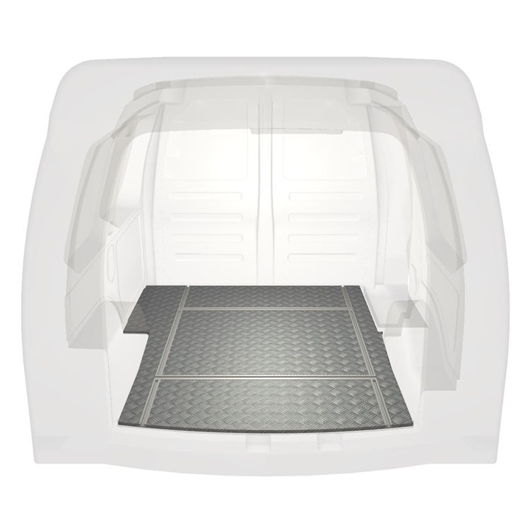Plancher léger et robuste avec rails transversaux pour une Volkswagen Caddy avec une plaque de roulement en aluminium antidérapant et des rails de chargement (longitudinaux et transversaux) pour une installation rapide et sûre des systèmes de rayonnage et autres accessoires.