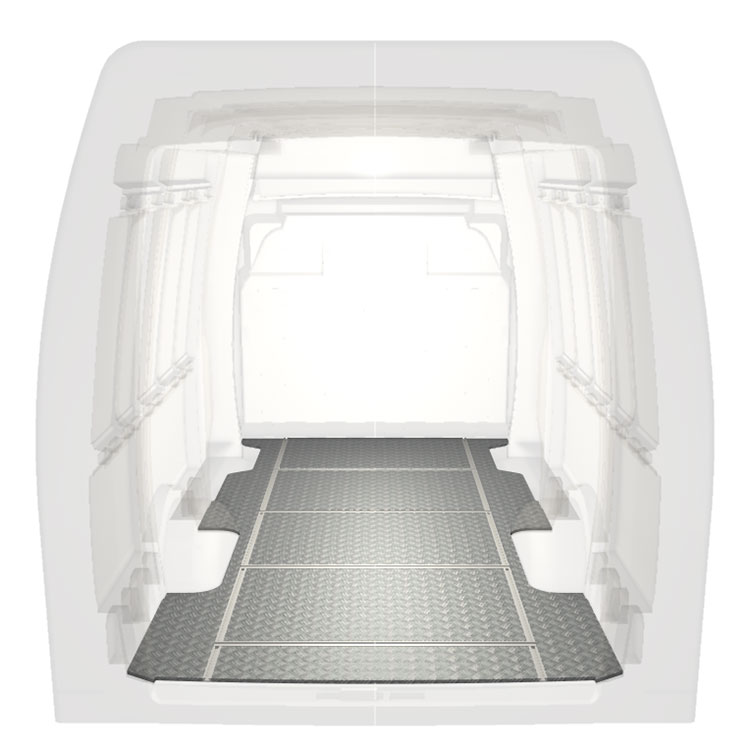 Plancher léger et robuste avec rails transversaux pour une Iveco Daily avec une plaque de roulement en aluminium antidérapant et des rails de chargement (longitudinaux et transversaux) pour une installation rapide et sûre des systèmes de rayonnage et autres accessoires.