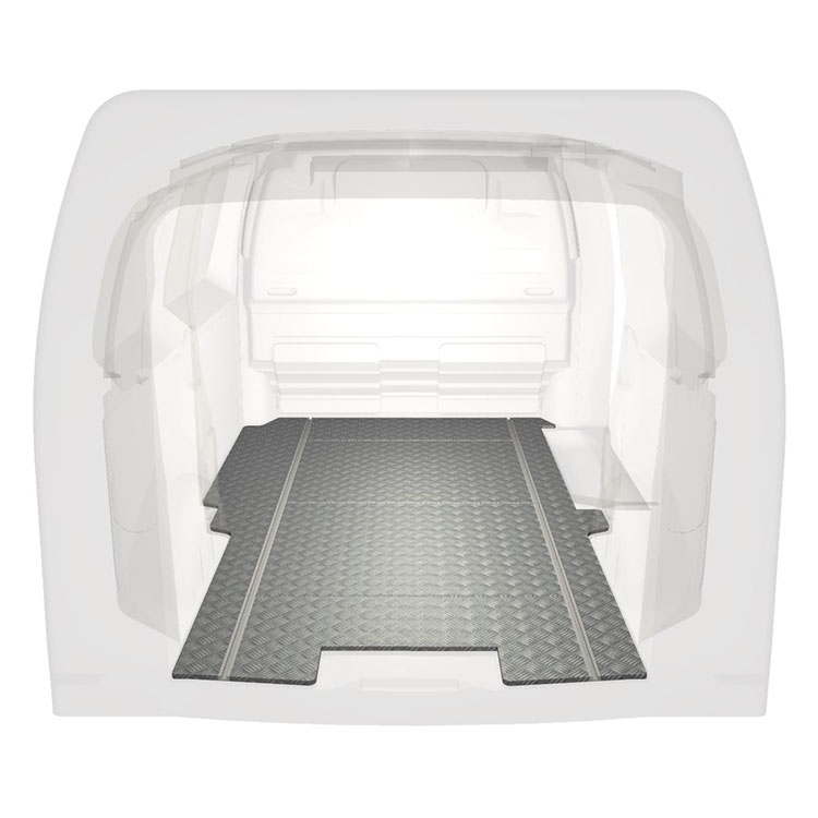 Plancher standard ultra-léger et robuste pour une Citroën Jumpy / Peugeot Expert / Toyota ProAce avec une plaque de roulement en aluminium antidérapant et des rails de chargement (longitudinaux) pour une installation rapide et sûre des systèmes de rayonnage et autres accessoires.