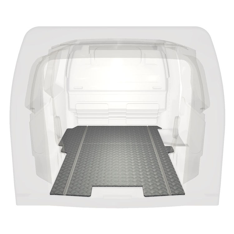 Plancher standard ultra-léger et robuste pour une Citroën Jumpy / Peugeot Expert / Toyota ProAce avec une plaque de roulement en aluminium antidérapant et des rails de chargement (longitudinaux) pour une installation rapide et sûre des systèmes de rayonnage et autres accessoires.
