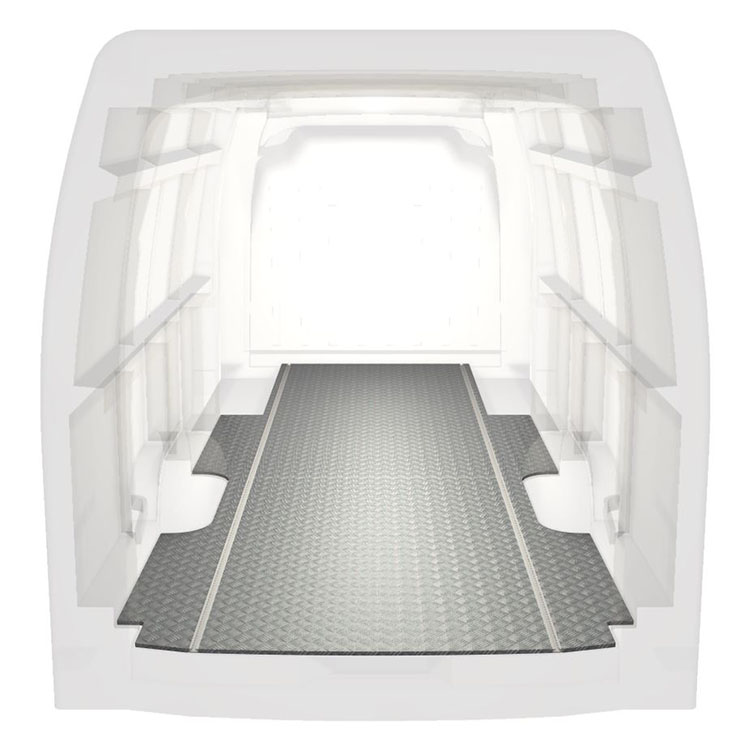 Plancher très long léger et robuste pour une Renault Master / Opel Movano / Nissan NV400 avec une plaque de roulement en aluminium antidérapant et des rails de chargement (longitudinaux) pour une installation rapide et sûre des systèmes de rayonnage et autres accessoires.