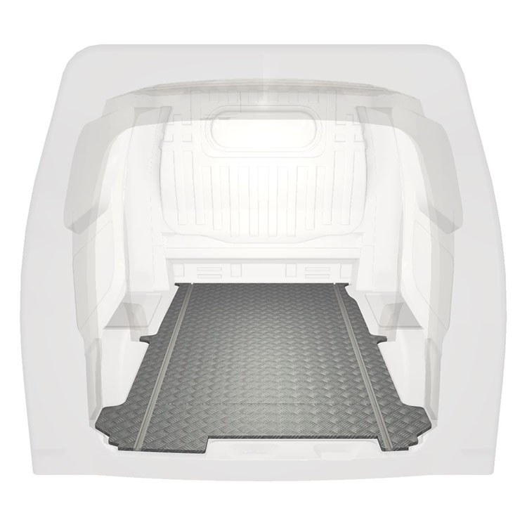 Plancher très long léger et robuste pour une Nissan NV200 avec une plaque de roulement en aluminium antidérapant et des rails de chargement (longitudinaux) pour une installation rapide et sûre des systèmes de rayonnage et autres accessoires.