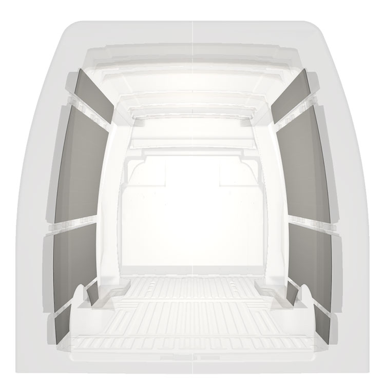 Revêtement léger pré-découpé pour les parois intérieures d’une Iveco Daily avec doubles portes latérales. Les parois créeront un environnement professionnel lumineux et convivial et se nettoient facilement.