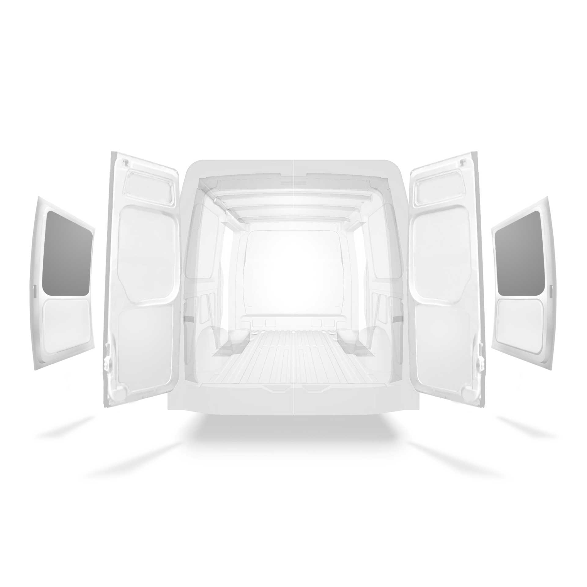 Revêtement léger pour la partie supérieure de la porte latérale d’une Mercedes Sprinter avec doubles portes. Le revêtement réduira l’usure normale à l'intérieur et contribuera à maintenir la valeur résiduelle de l’utilitaire.