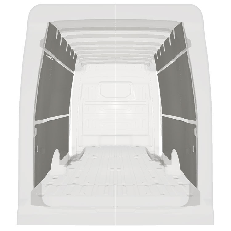 Revêtement léger pré-découpé pour les parois intérieures d’une Volkswagen Crafter / MAN TGE avec doubles portes latérales. Les parois créeront un environnement professionnel lumineux et convivial et se nettoient facilement.