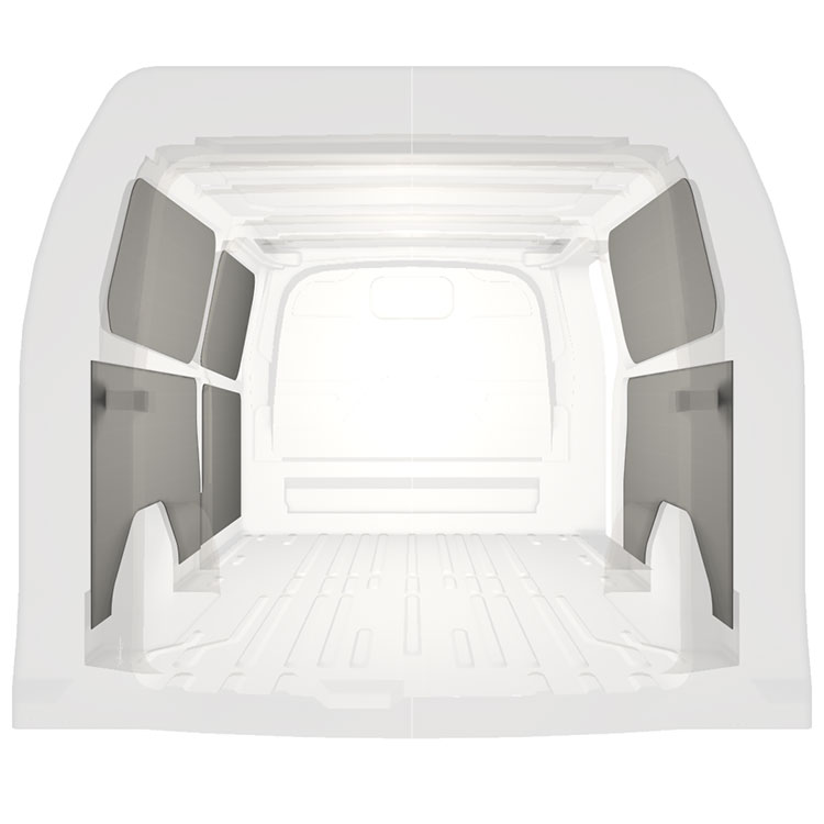 Revêtement de parois léger pour parois intérieures d’une Ford Transit Custom avec une porte latérale à droite. Les parois créeront un environnement professionnel lumineux et convivial et se nettoient facilement.