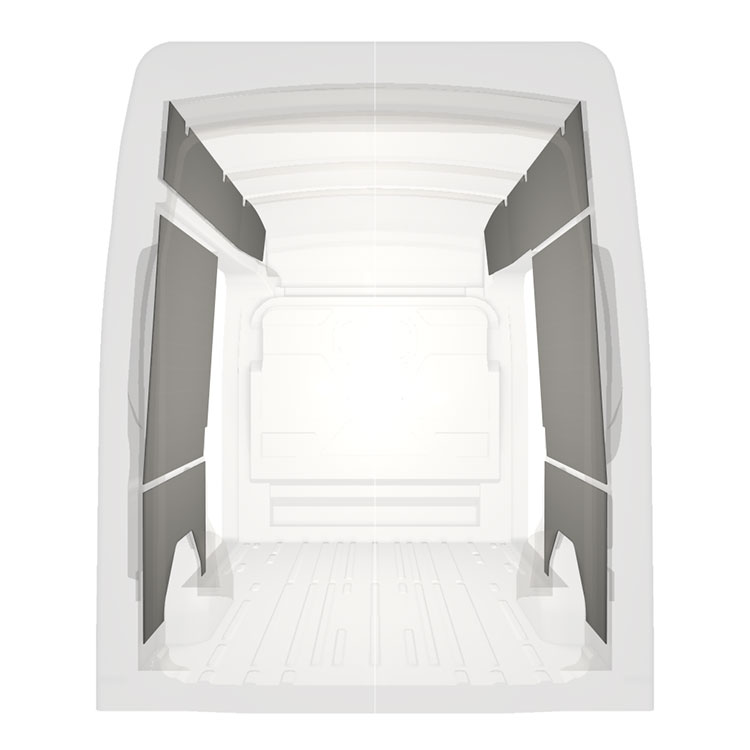 Revêtement léger pré-découpé pour les parois intérieures d’une Ford Transit avec doubles portes latérales. Les parois créeront un environnement professionnel lumineux et convivial et se nettoient facilement.