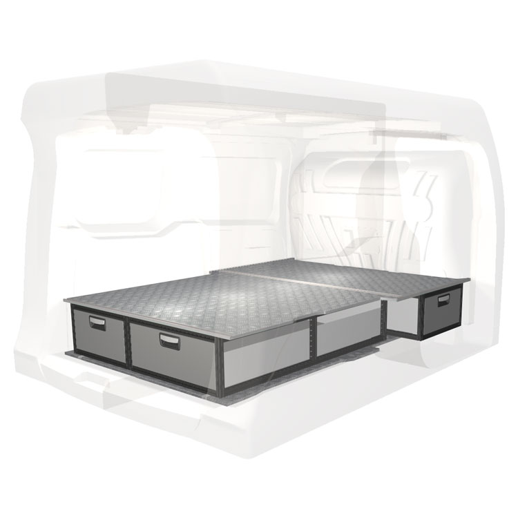 The kit is designed to be fitted on top of a Modul-Floor, utilizing the floor rails for a non-intrusive installation. The double floor is equipped with rails for easy installation of vehicle racking, and edging strips for a nice finish.