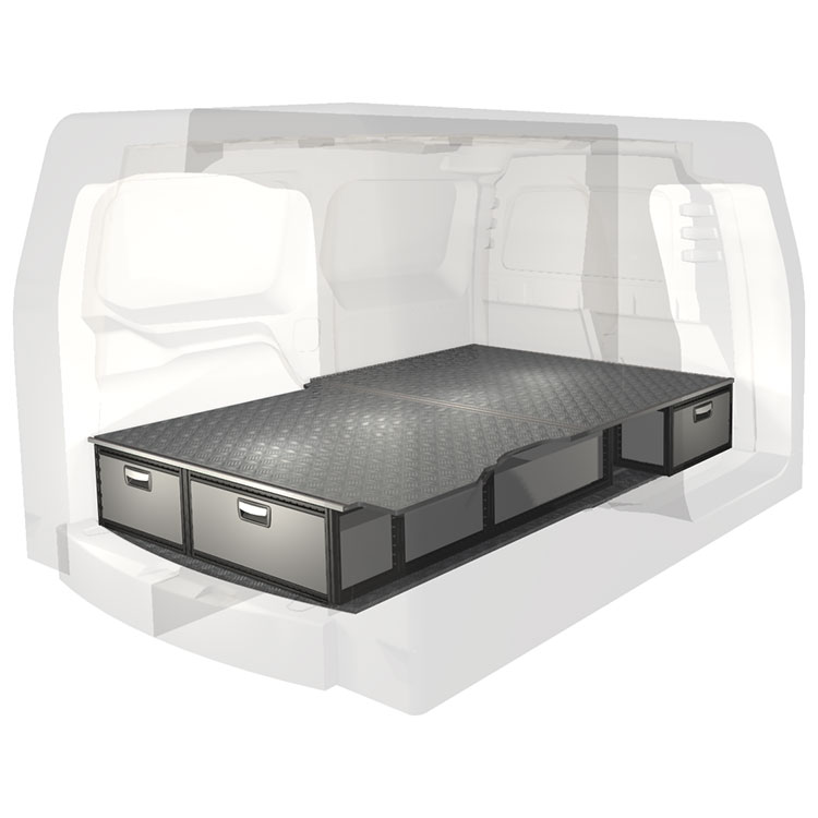 The kit is designed to be fitted on top of a Modul-Floor, utilizing the floor rails for a non-intrusive installation. The double floor is equipped with rails for easy installation of vehicle racking, and edging strips for a nice finish.
