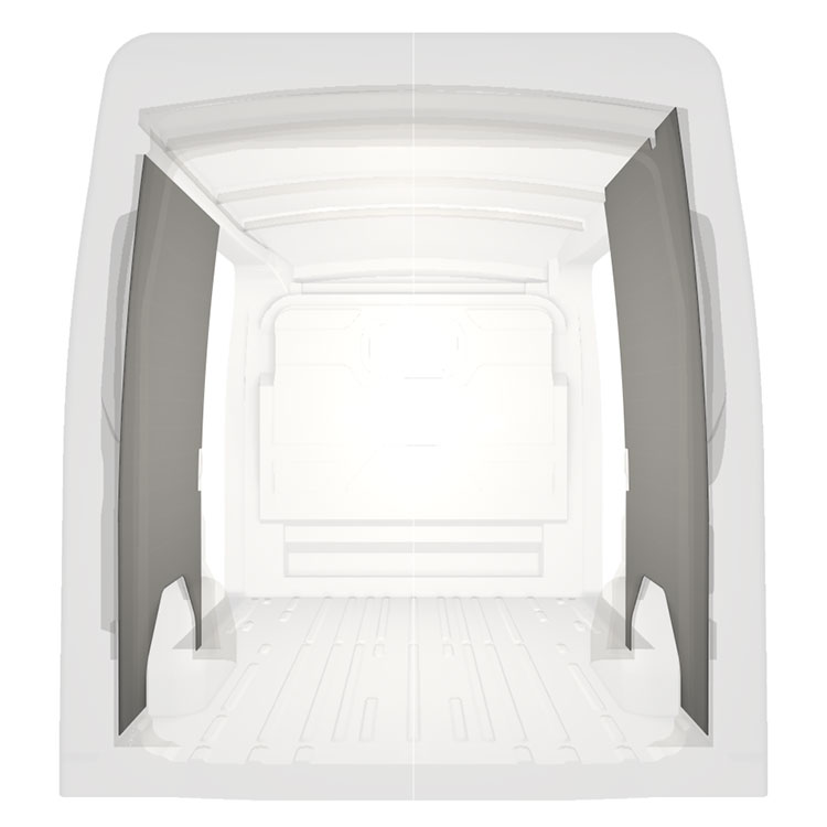 Revêtement entièrement léger pour les parois intérieures d’une Ford Transit avec doubles portes latérales. Les parois créeront un environnement professionnel lumineux et convivial et se nettoient facilement.