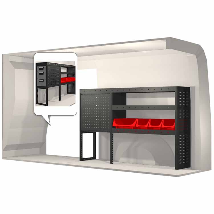 Ce système d’aménagement a été spécialement conçu pour assurer une adaptation optimale ainsi que la meilleure fonctionnalité et sécurité possible. Il a été développé pour un usage professionnel, est flexible et est destiné à des métiers de services dans des domaines variés. Toutes les étagères sont équipées de tapis caoutchouc, et tous les tiroirs de tapis mousse. Les composants d’assemblage et de fixation sont inclus.