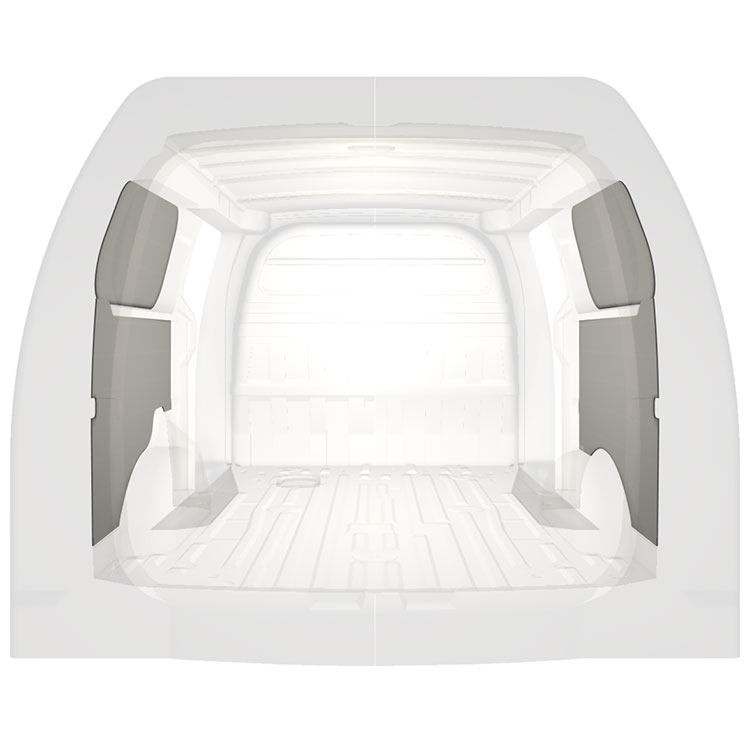 Revêtement léger pré-découpé pour les parois intérieures d’une Hyundai H1 avec doubles portes latérales. Les parois créeront un environnement professionnel lumineux et convivial et se nettoient facilement.