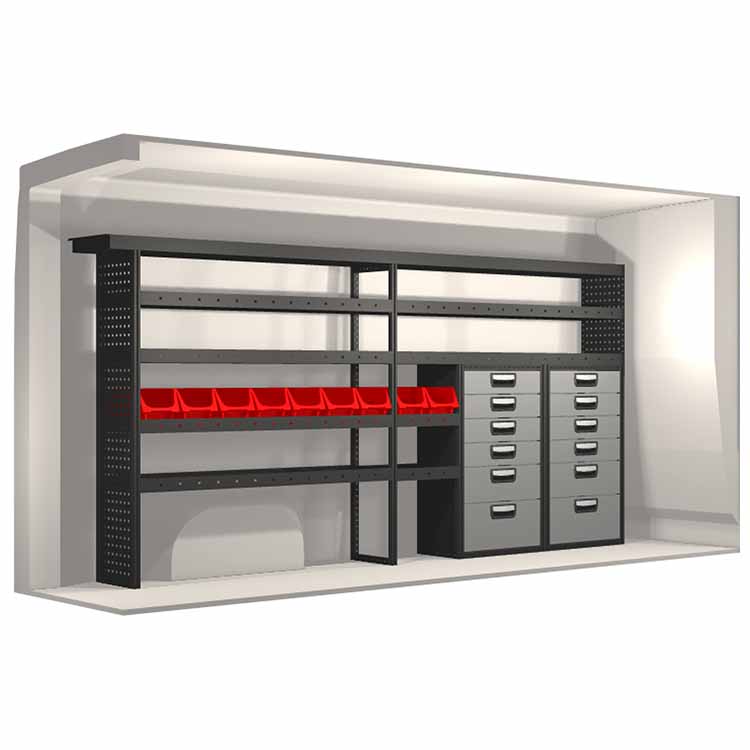 Ce système d’aménagement a été spécialement conçu pour assurer une adaptation optimale ainsi que la meilleure fonctionnalité et sécurité possible. Il a été développé pour un usage professionnel, est flexible et est destiné à des métiers de services dans des domaines variés. Toutes les étagères sont équipées de tapis caoutchouc, et tous les tiroirs de tapis mousse. Les composants d’assemblage et de fixation sont inclus.
