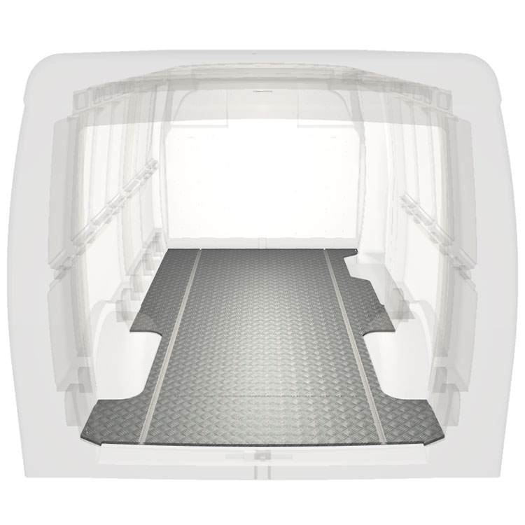 Plancher standard ultra-léger et robuste pour une Iveco Daily avec une plaque de roulement en aluminium antidérapant et des rails de chargement (longitudinaux) pour une installation rapide et sûre des systèmes de rayonnage et autres accessoires.