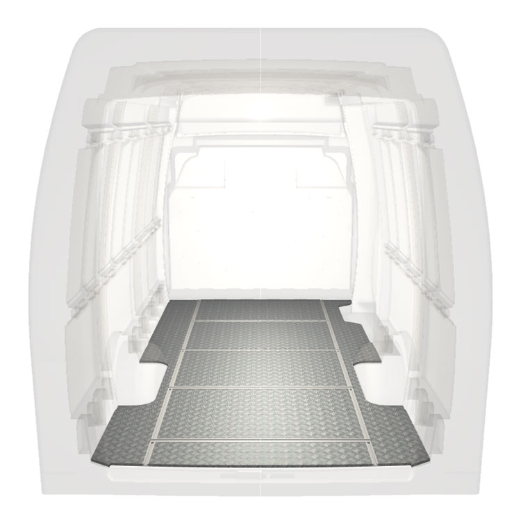 Plancher léger et robuste avec rails transversaux pour une Iveco Daily avec une plaque de roulement en aluminium antidérapant et des rails de chargement (longitudinaux et transversaux) pour une installation rapide et sûre des systèmes de rayonnage et autres accessoires.