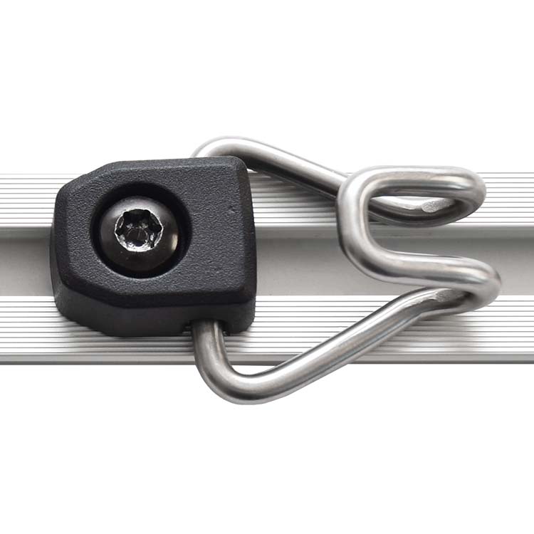 Les accessoires tels que les œillets d’arrimage, les crochets d’arrimage et les barres de chargement se montent sans peine et directement sur les rails du plancher.