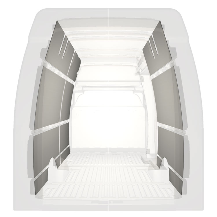 Revêtement de parois léger pour parois intérieures d’une Iveco Daily avec une porte latérale à droite. Les parois créeront un environnement professionnel lumineux et convivial et se nettoient facilement.
