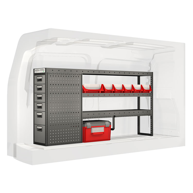 Ce système d’aménagement a été spécialement conçu pour assurer une adaptation optimale ainsi que la meilleure fonctionnalité et sécurité possible. Il a été développé pour un usage professionnel, est flexible et est destiné à des métiers de services dans des domaines variés. Toutes les étagères sont équipées de tapis caoutchouc, et tous les tiroirs de tapis mousse. Les composants d’assemblage et de fixation sont inclus.