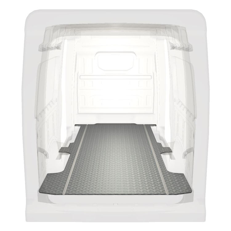 Plancher très long léger et robuste pour une Volkswagen Crafter / MAN TGE avec une plaque de roulement en aluminium antidérapant et des rails de chargement (longitudinaux) pour une installation rapide et sûre des systèmes de rayonnage et autres accessoires.
