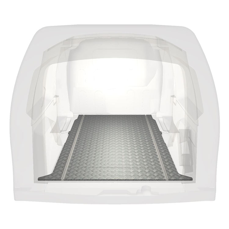 Plancher très long léger et robuste pour une Mercedes Citan / Renault Kangoo avec une plaque de roulement en aluminium antidérapant et des rails de chargement (longitudinaux) pour une installation rapide et sûre des systèmes de rayonnage et autres accessoires.