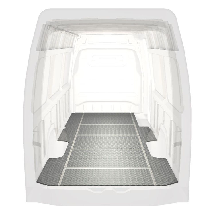 Plancher léger et robuste avec rails transversaux pour une Mercedes Sprinter avec une plaque de roulement en aluminium antidérapant et des rails de chargement (longitudinaux et transversaux) pour une installation rapide et sûre des systèmes de rayonnage et autres accessoires.
