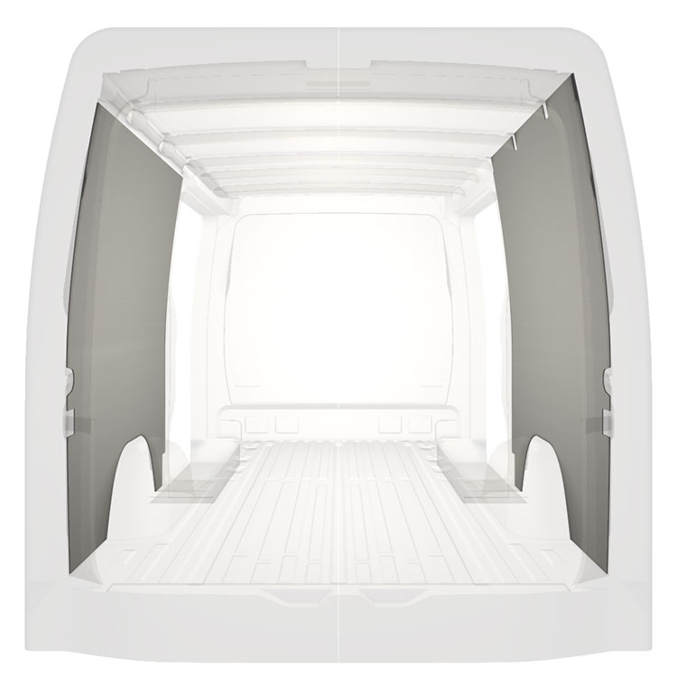 Revêtement entièrement léger pour les parois intérieures d’une Mercedes Sprinter avec doubles portes latérales. Les parois créeront un environnement professionnel lumineux et convivial et se nettoient facilement.