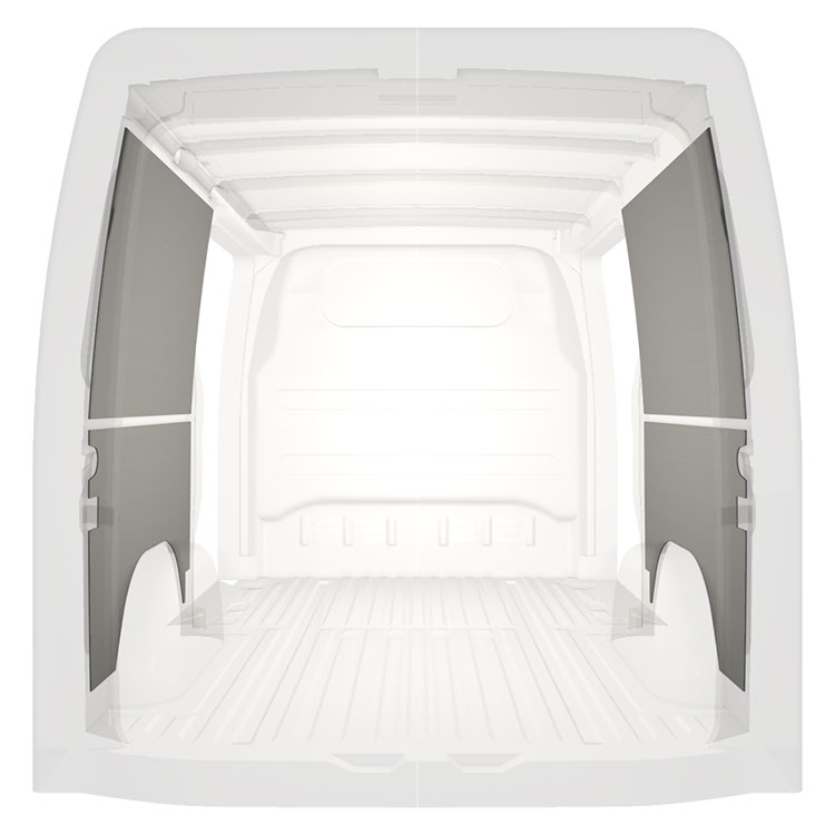 Revêtement léger pré-découpé pour les parois intérieures d’une Mercedes Sprinter avec doubles portes latérales. Les parois créeront un environnement professionnel lumineux et convivial et se nettoient facilement.