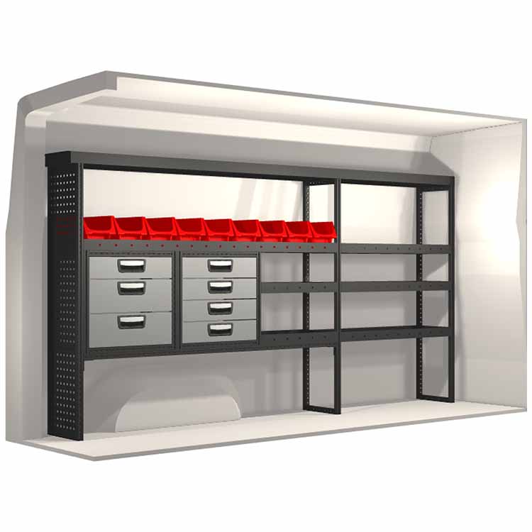 Ce système d’aménagement a été spécialement conçu pour assurer une adaptation optimale ainsi que la meilleure fonctionnalité et sécurité possible. Il a été développé pour un usage professionnel, est flexible et est destiné à des métiers de services dans des domaines variés. Toutes les étagères sont équipées de tapis caoutchouc, et tous les tiroirs de tapis mousse. Les composants d’assemblage et de fixation sont inclus.