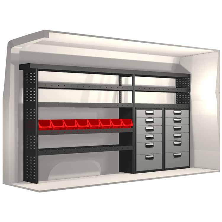 Ce système d’aménagement a été spécialement conçu pour assurer une adaptation optimale ainsi que la meilleure fonctionnalité et sécurité possible. Il a été développé pour un usage professionnel, est flexible et est destiné à des métiers de services dans des domaines variés. Toutes les étagères sont équipées de tapis caoutchouc, et tous les tiroirs de tapis mousse. Les composants d’assemblage et de fixation sont inclus.