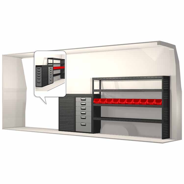 Ce système d’aménagement a été spécialement conçu pour assurer une adaptation optimale ainsi que la meilleure fonctionnalité et sécurité possible. Il a été développé pour un usage professionnel, est flexible et est destiné à des métiers de services dans des domaines variés. Toutes les étagères sont équipées de tapis caoutchouc, et tous les tiroirs de tapis mousse. Les composants d’assemblage et de fixation sont inclus.