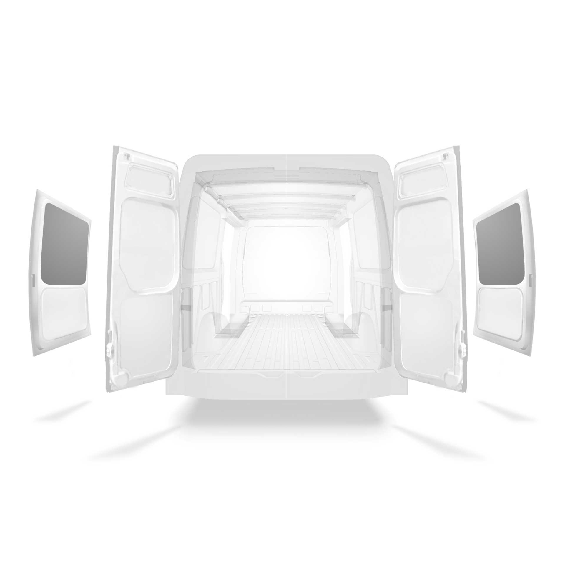 Revêtement léger pour la partie supérieure de la porte latérale d’une Mercedes Sprinter avec doubles portes. Le revêtement réduira l’usure normale à l'intérieur et contribuera à maintenir la valeur résiduelle de l’utilitaire.