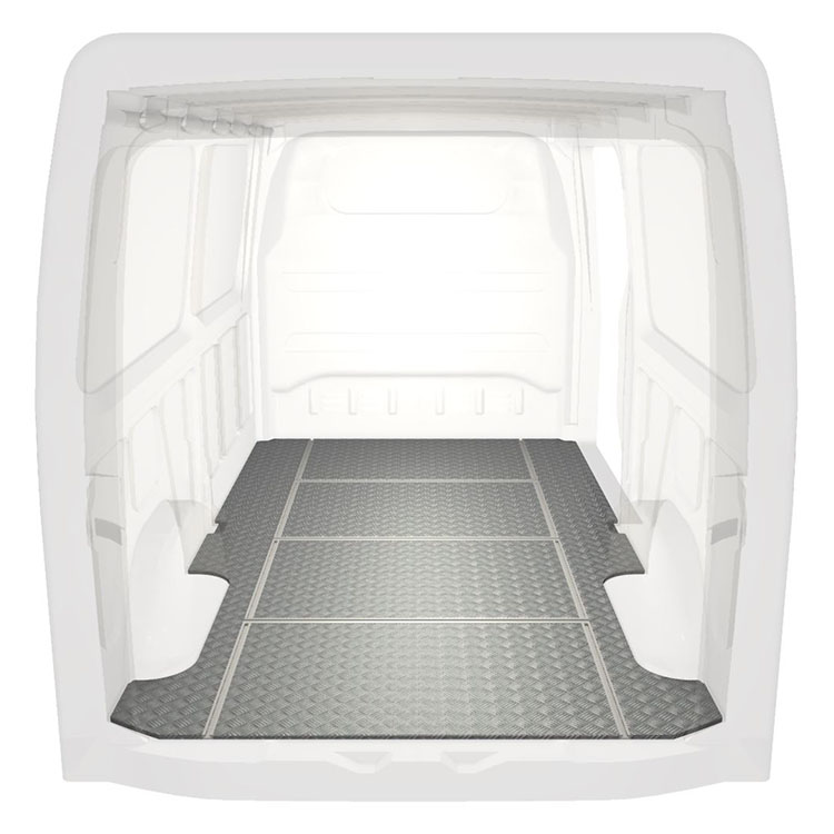 Plancher léger et robuste avec rails transversaux pour une Mercedes Sprinter avec une plaque de roulement en aluminium antidérapant et des rails de chargement (longitudinaux et transversaux) pour une installation rapide et sûre des systèmes de rayonnage et autres accessoires.