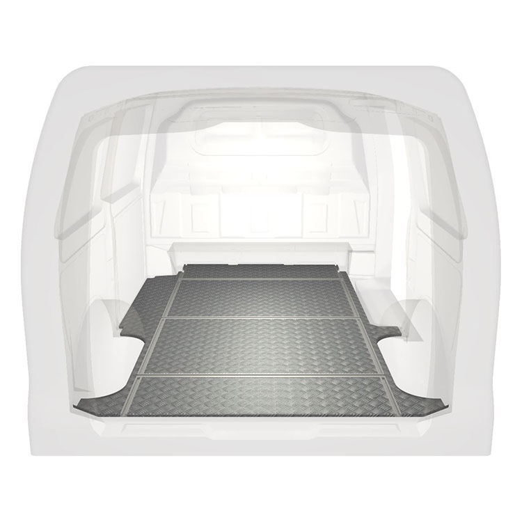 Plancher léger et robuste avec rails transversaux pour une Mercedes Vito avec une plaque de roulement en aluminium antidérapant et des rails de chargement (longitudinaux et transversaux) pour une installation rapide et sûre des systèmes de rayonnage et autres accessoires.
