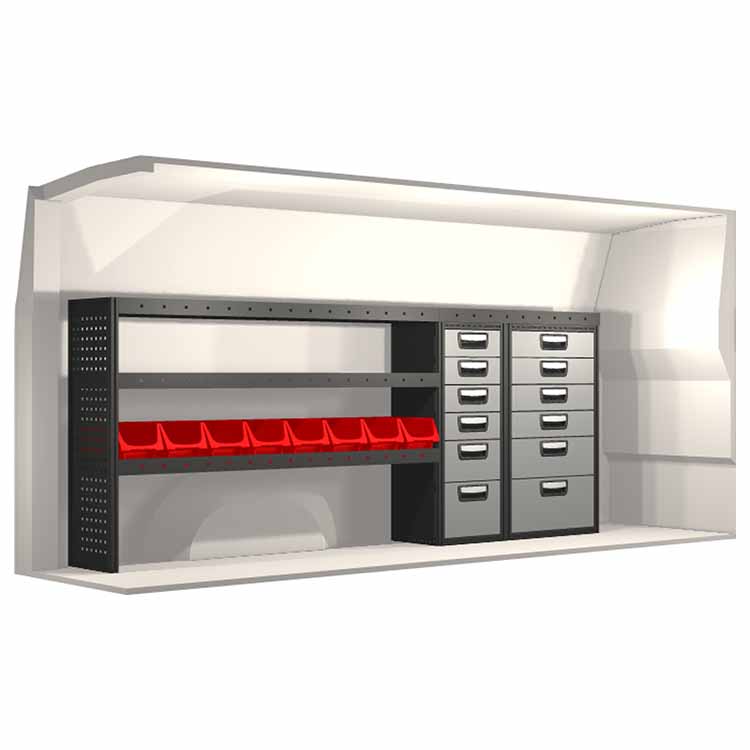 Ce système d’aménagement a été spécialement conçu pour assurer une adaptation optimale ainsi que la meilleure fonctionnalité et sécurité possible. Il a été développé pour un usage professionnel, est flexible et est destiné à des métiers de services dans des domaines variés. Toutes les étagères sont équipées de tapis caoutchouc, et tous les tiroirs de tapis mousse. Les composants d’assemblage et de fixation sont inclus.