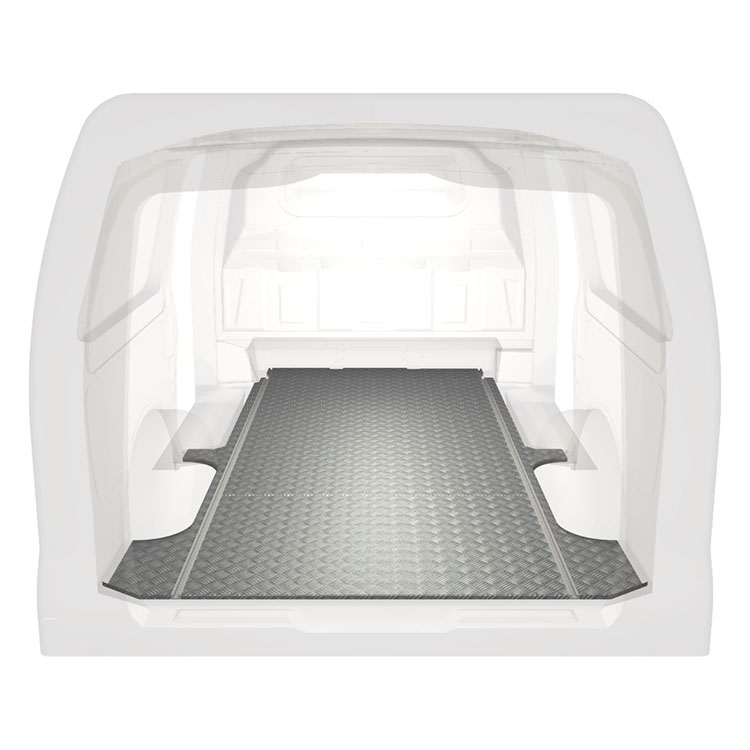Plancher standard ultra-léger et robuste pour une Mercedes Vito avec une plaque de roulement en aluminium antidérapant et des rails de chargement (longitudinaux) pour une installation rapide et sûre des systèmes de rayonnage et autres accessoires.