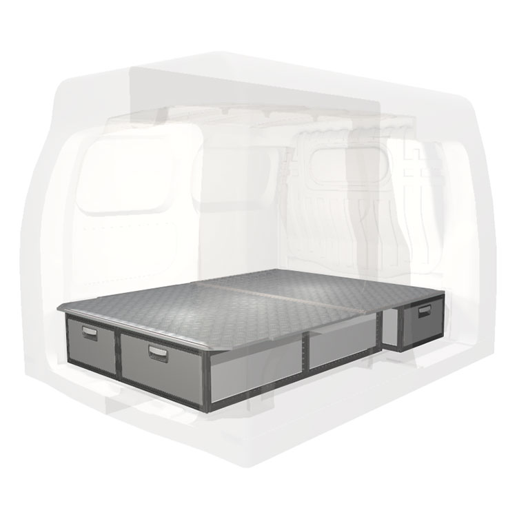 The kit is designed to be fitted on top of a wooden floor. The double floor is equipped with rails for easy installation of vehicle racking, and edging strips for a nice finish.