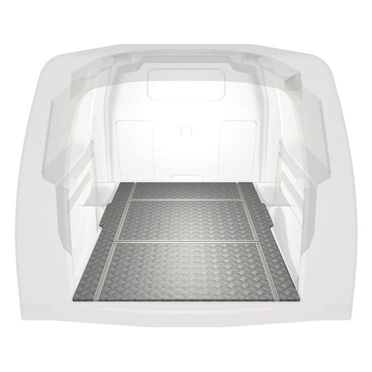 Plancher léger et robuste avec rails transversaux pour une Berlingo/Partner/Combo 19- avec une plaque de roulement en aluminium antidérapant et des rails de chargement (longitudinaux et transversaux) pour une installation rapide et sûre des systèmes de rayonnage et autres accessoires.