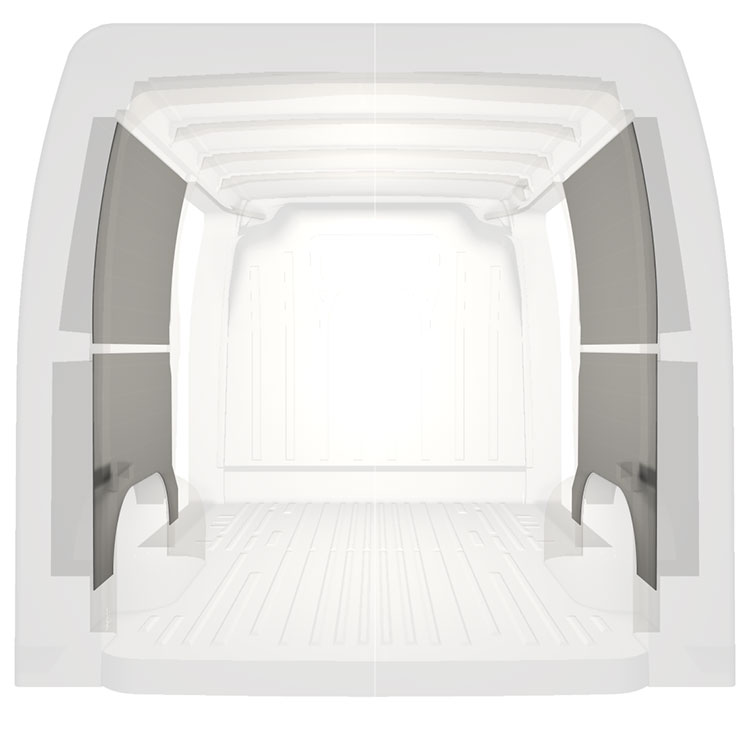Revêtement léger pré-découpé pour les parois intérieures d’une Renault Master / Opel Movano / Nissan NV400 avec doubles portes latérales. Les parois créeront un environnement professionnel lumineux et convivial et se nettoient facilement.