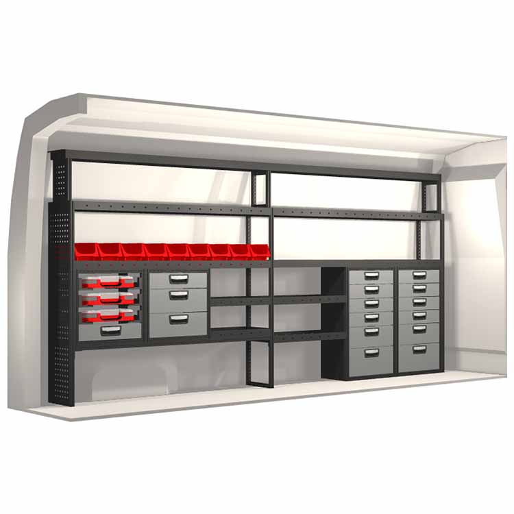 Ce système d’aménagement a été spécialement conçu pour assurer une adaptation optimale ainsi que la meilleure fonctionnalité et sécurité possible. Il a été développé pour un usage professionnel, est flexible et est destiné à des métiers de services dans des domaines variés. Toutes les étagères sont équipées de tapis caoutchouc, et tous les tiroirs de tapis mousse. Les composants d’assemblage et de fixation sont inclus.